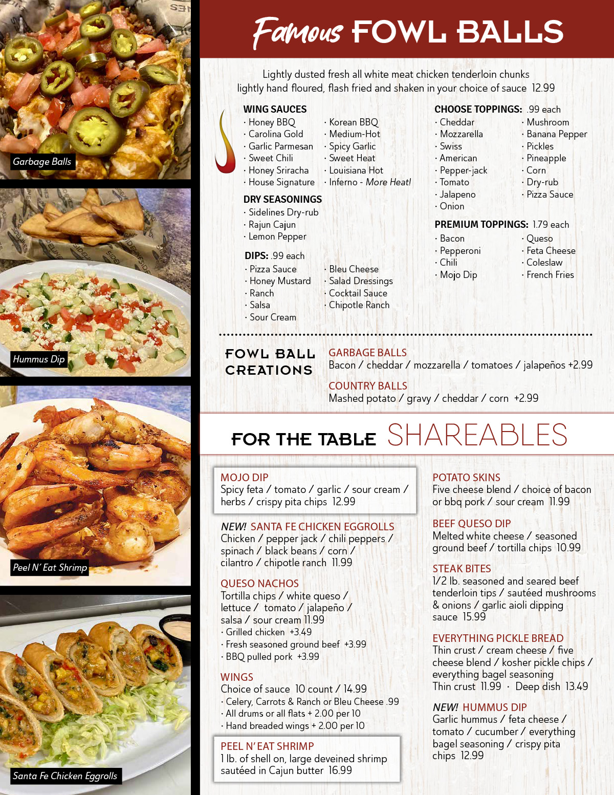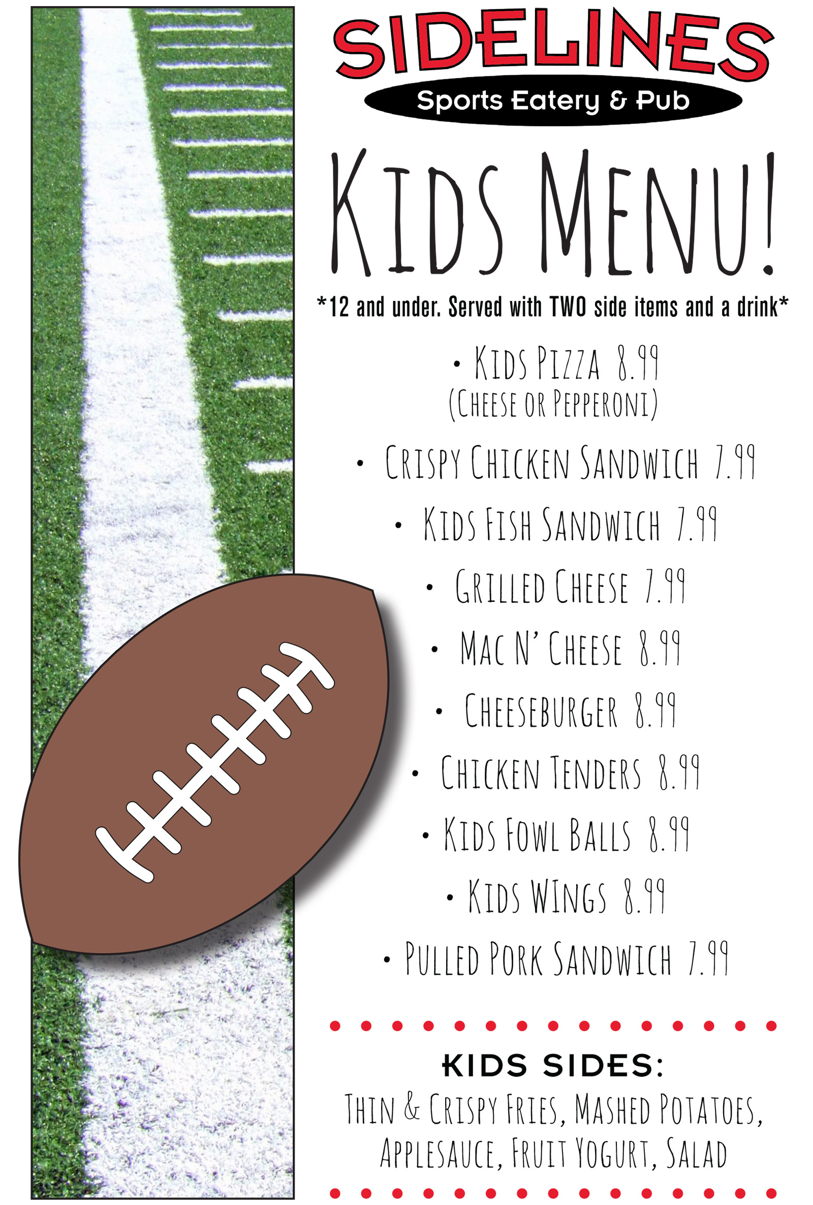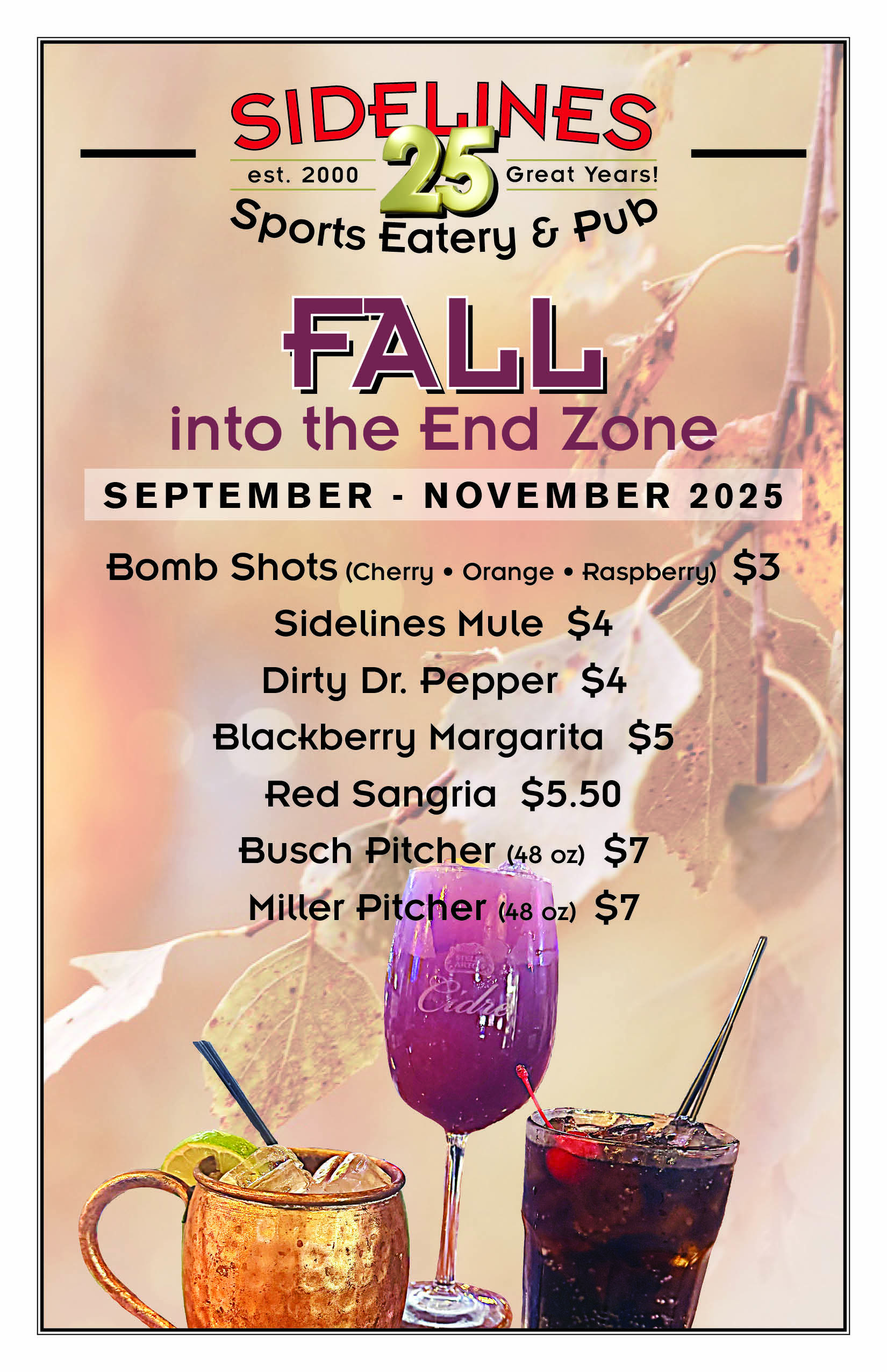Explore a menu packed with flavor and unique items! Whether you’re in the mood for classic American favorites or something with a twist, Sidelines Sports Eatery has you covered. From our famous fowl balls to our mouthwatering burgers, each dish is crafted to perfection. Check out our selection of appetizers, salads, sandwiches, and entrees that will satisfy any craving. Don’t forget to pair your meal with one of our signature cocktails or a cold beer from our extensive drink menu.