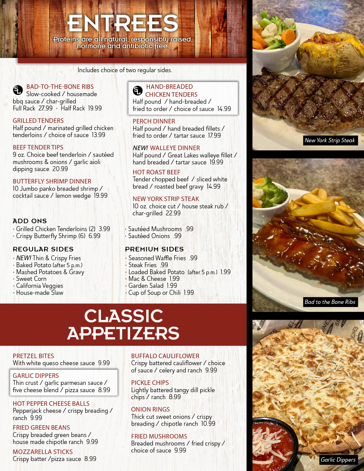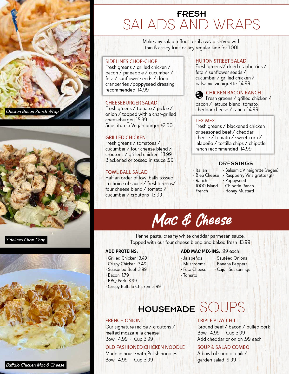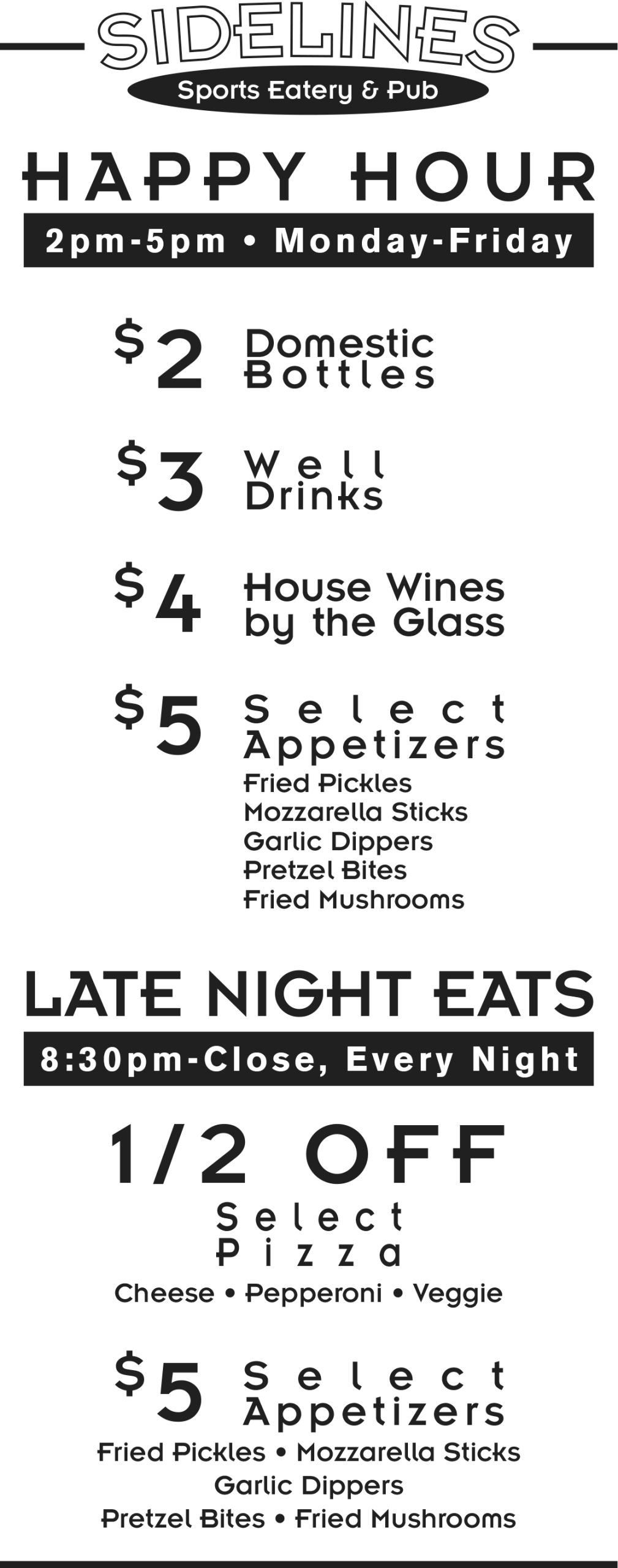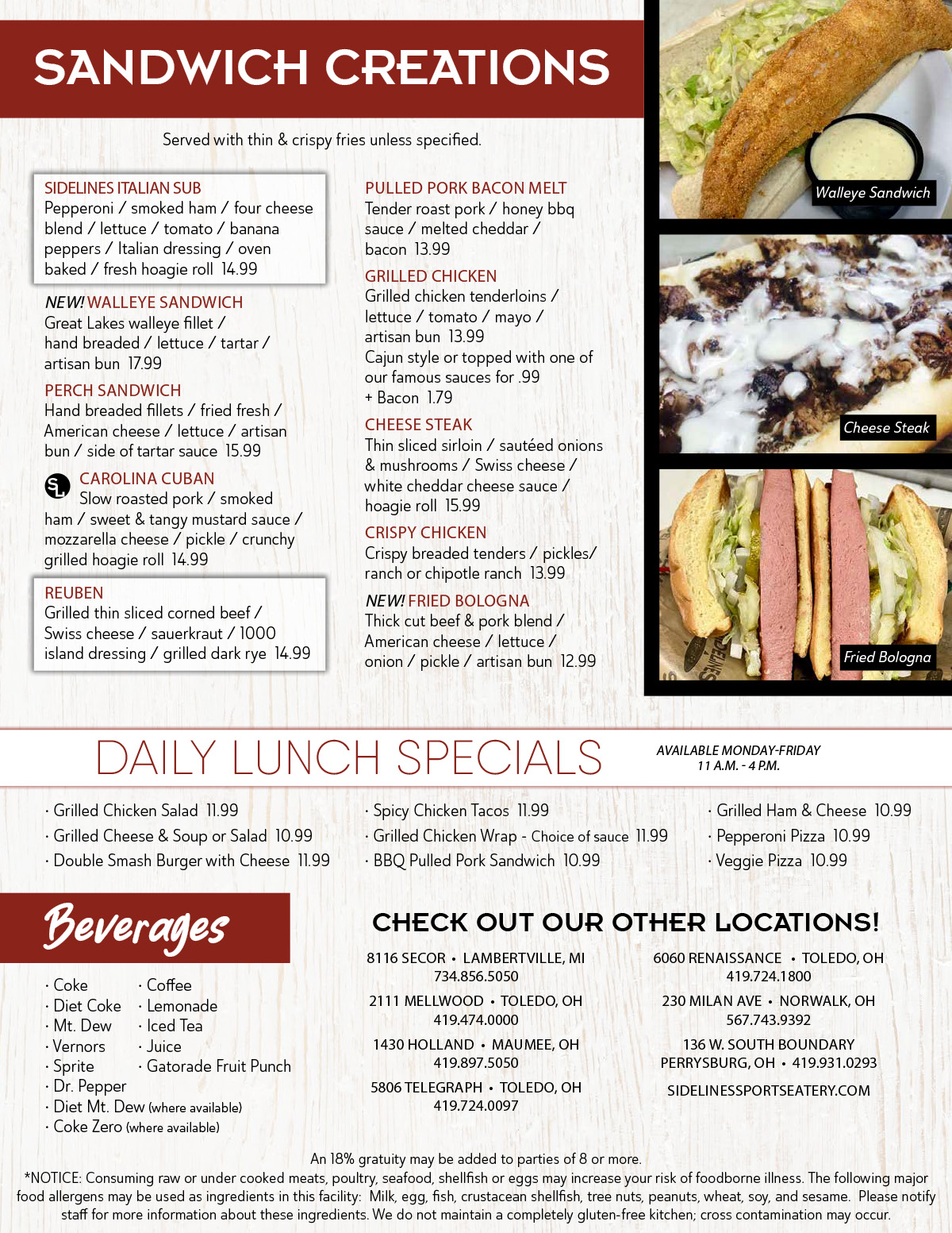 Explore a menu packed with flavor and unique items! Whether you’re in the mood for classic American favorites or something with a twist, Sidelines Sports Eatery has you covered. From our famous fowl balls to our mouthwatering burgers, each dish is crafted to perfection. Check out our selection of appetizers, salads, sandwiches, and entrees that will satisfy any craving. Don’t forget to pair your meal with one of our signature cocktails or a cold beer from our extensive drink menu.